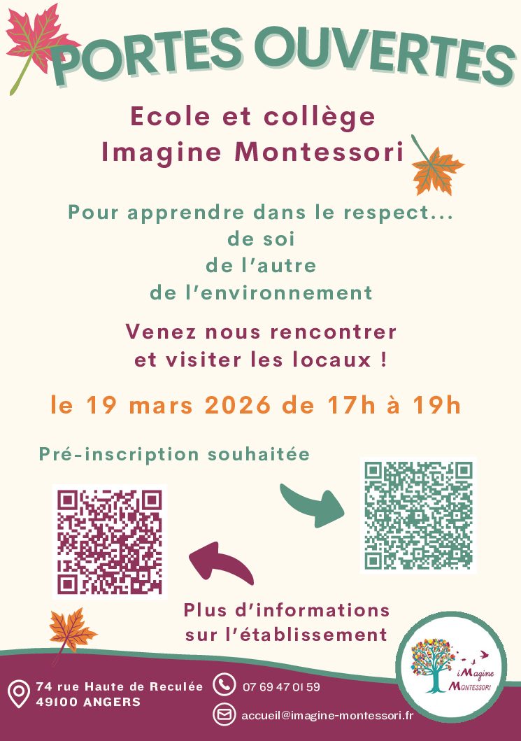C’est dans cet esprit que l’école et le collège Imagine Montessori ouvrent leurs portes au public le jeudi 19 mars 2026, de 17h à 20h, à Angers.